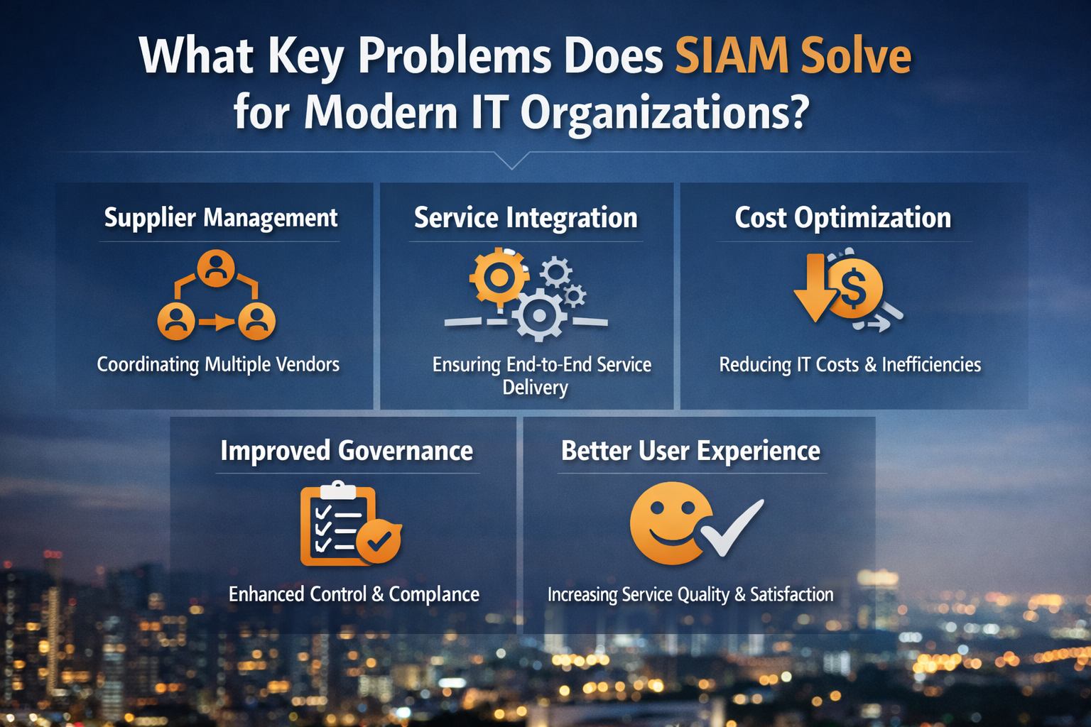 SIAM is not just a framework—it’s a practical solution to the real challenges faced by modern IT organizations. By improving accountability, integration, visibility, and alignment, SIAM helps organizations transform complex IT ecosystems into efficient, value-driven service models.